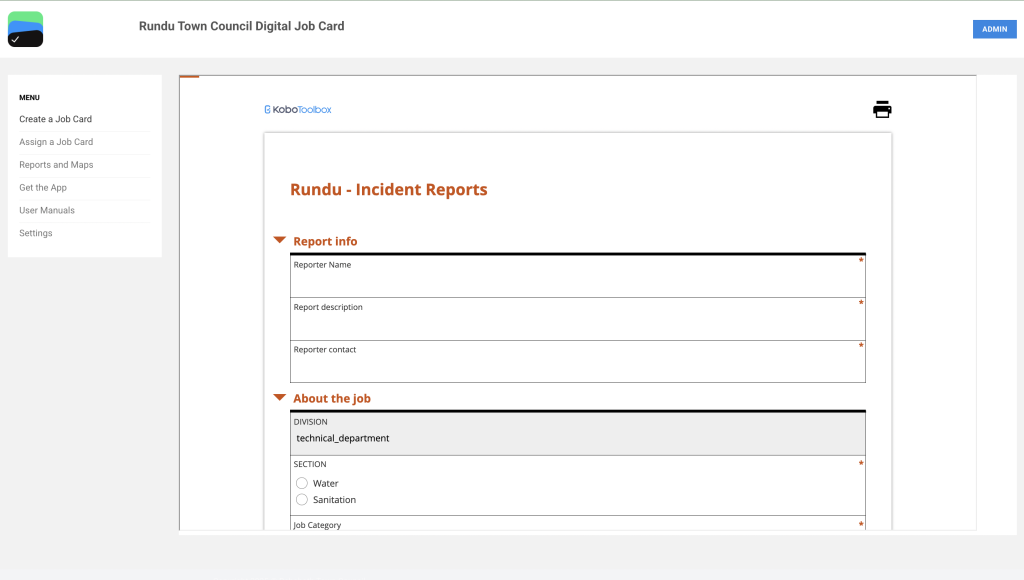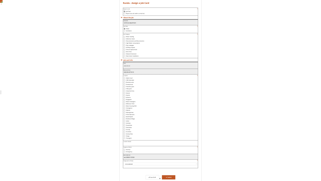 Given the artisan has permission to assign job cards go to https://rundu.digitaljobcard.org/ to access the Digital Job Card web app. Navigate to Assign a Job Card, a Rundu Incident Report form will open up to fill in.