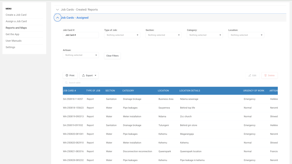 Navigate to ‘Reports and Maps’ on the web application, select ‘Assigned Job Cards,’ and choose either the job card assigned to you or the one you wish to share. Copy the job card number and share it using the team’s agreed method (e.g., SMS, WhatsApp, email). The job card number appears as shown in red.