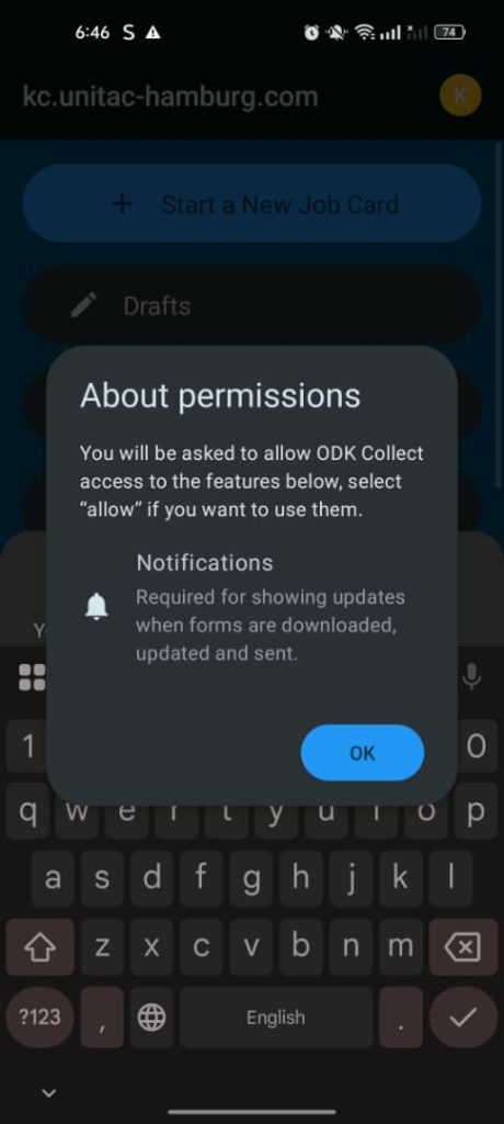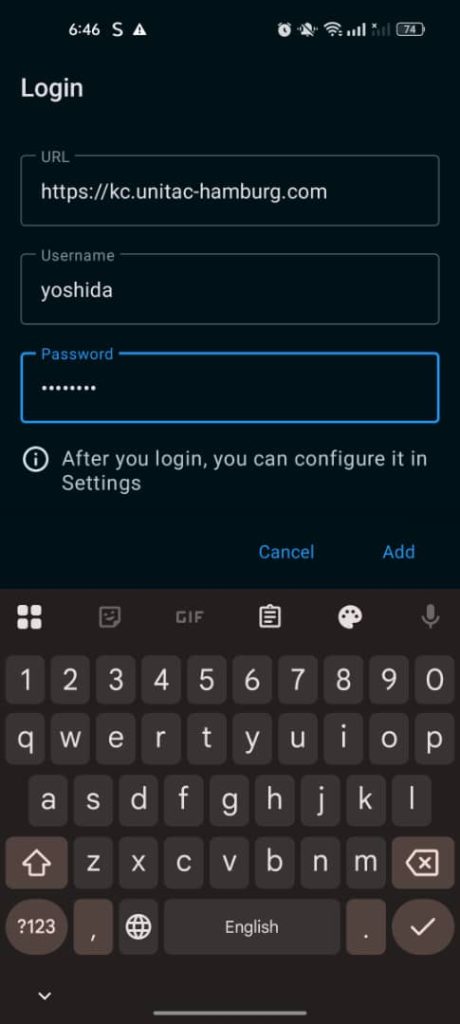 Enter the server URL: https://kf.unitac-hamburg.com and your username and password to begin.